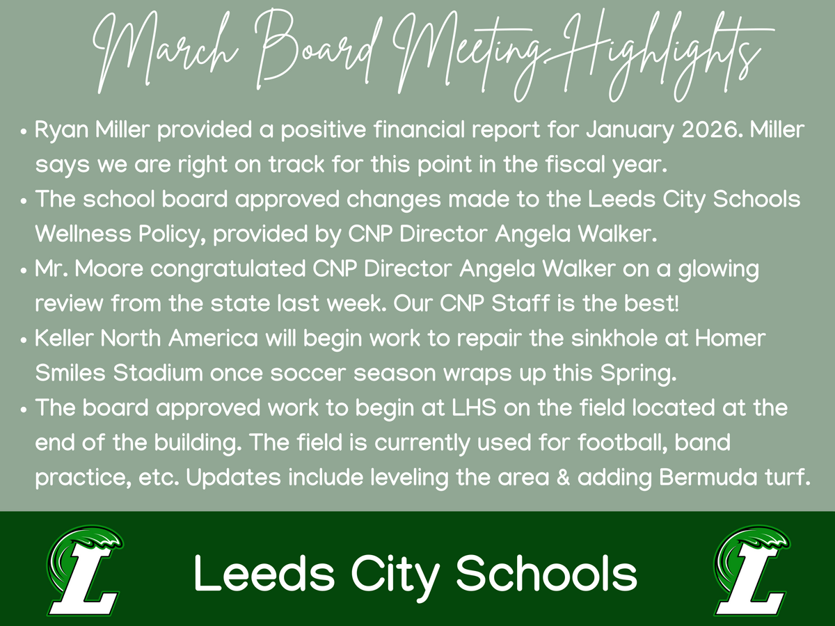 I encourage you to stay connected with our district through this website, social media, and our regular communications. Your involvement is essential to the success of our schools, and we look forward to working together to create an exceptional educational experience for all students. Thank you for your continued support of Leeds City Schools. Together, we will achieve great things!